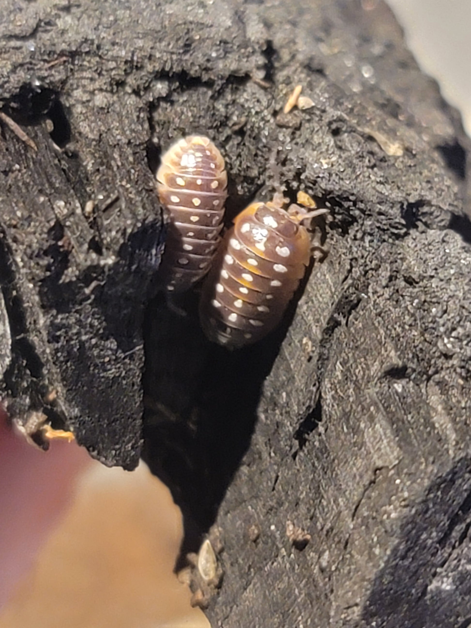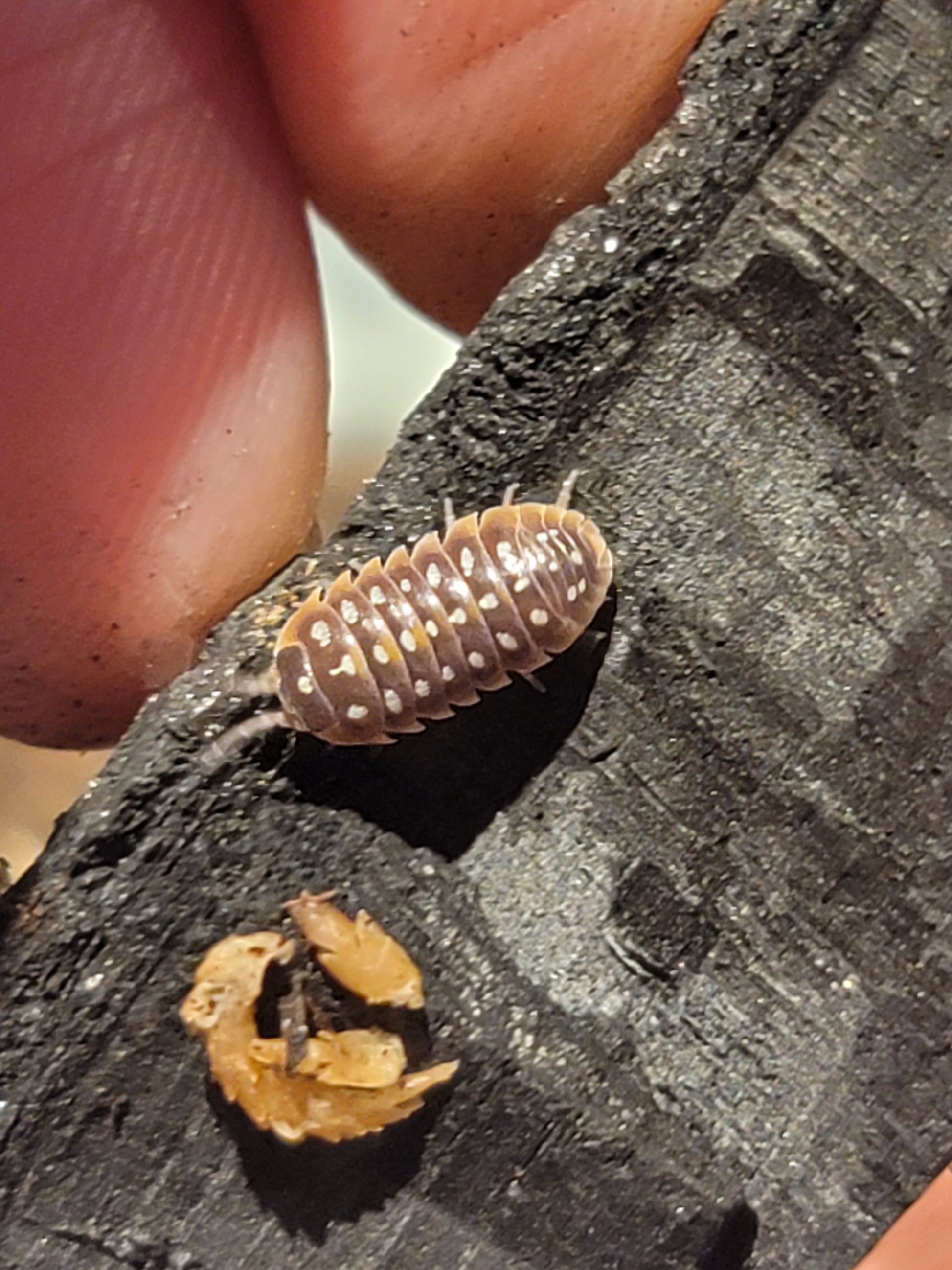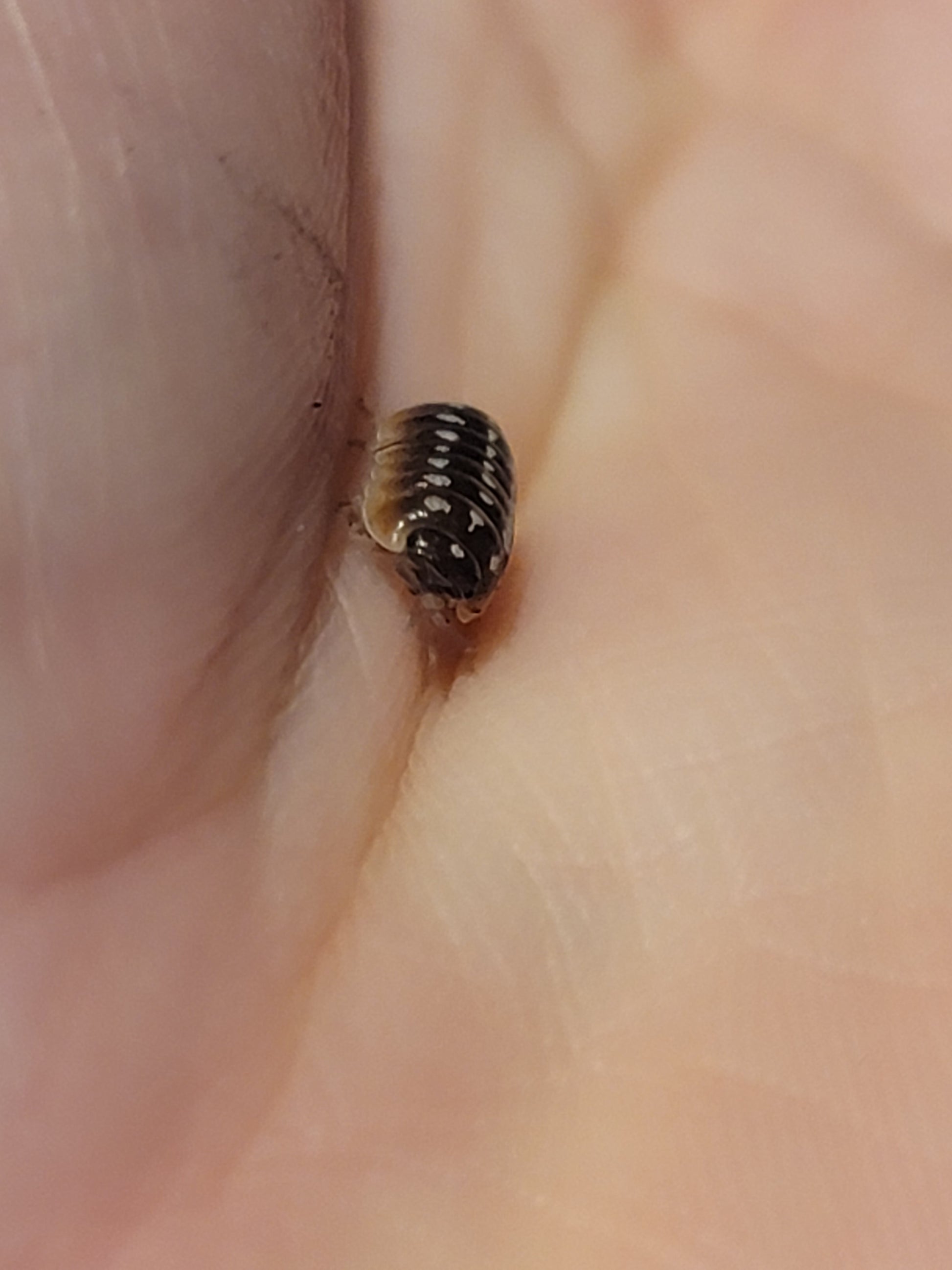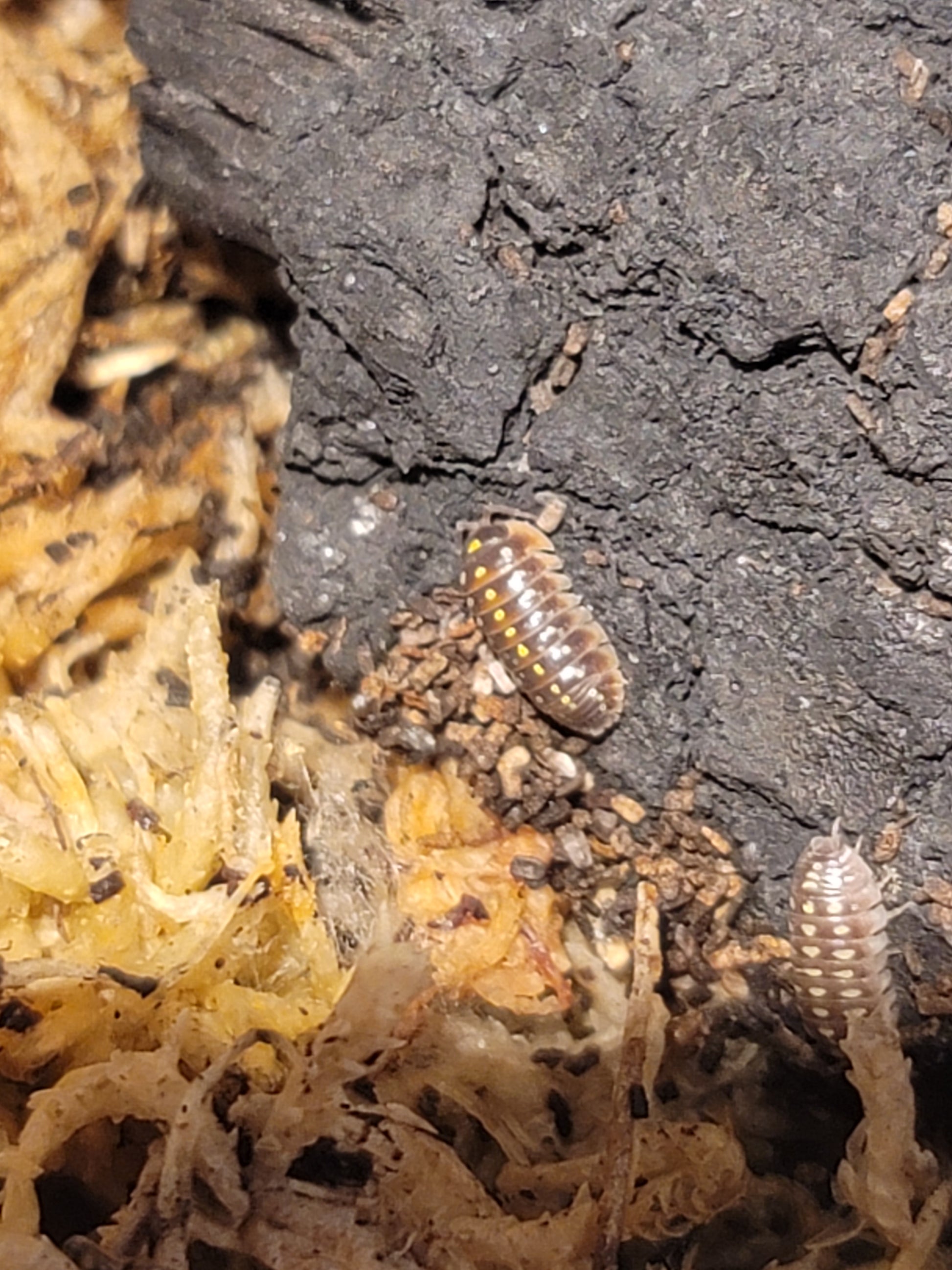 Pudding Isopods are from the genus Armadillidium. These Bbs are greyish brown with a thin skirt of white along the edge. They have three rows of spots from white to yellow.