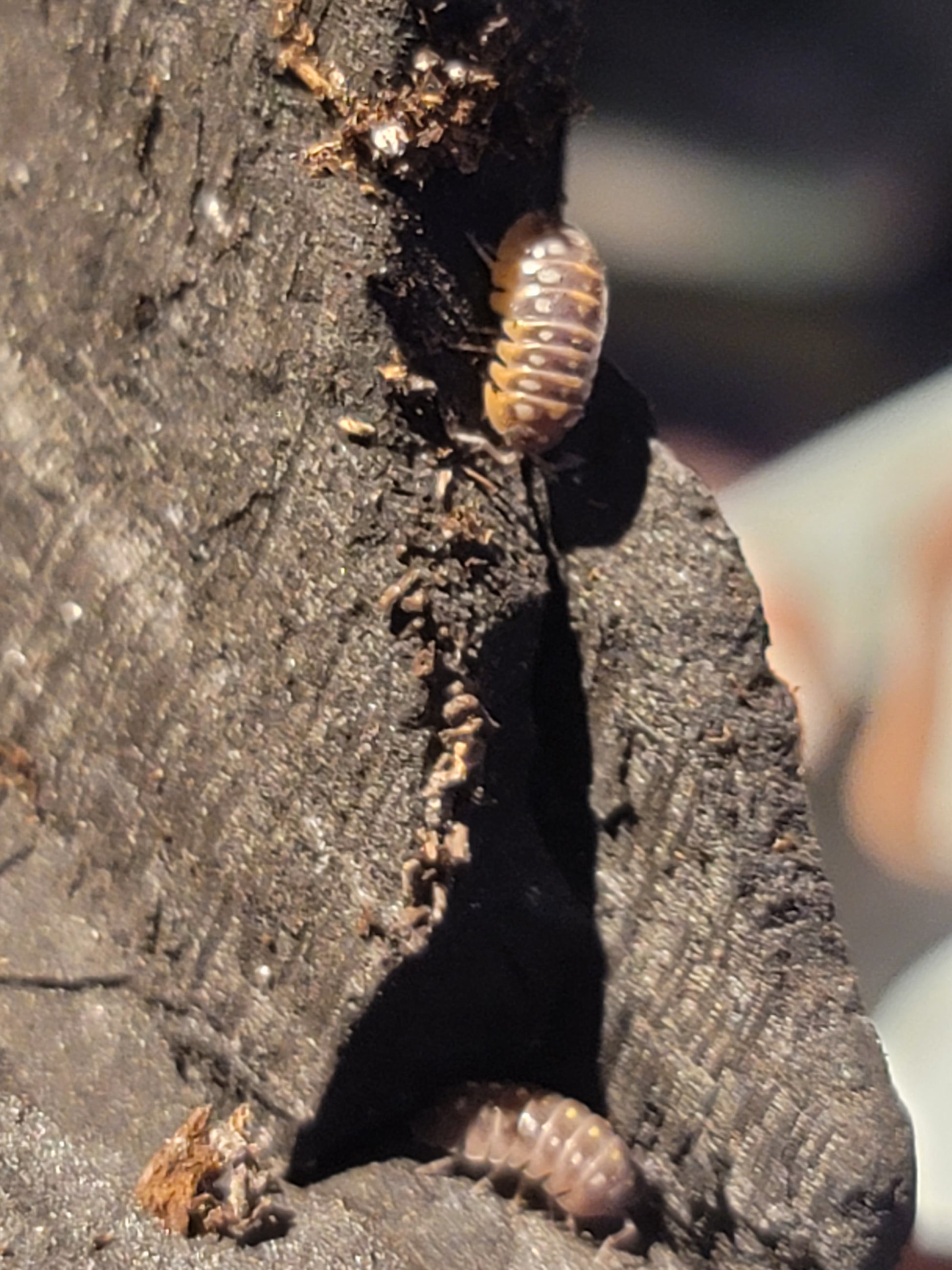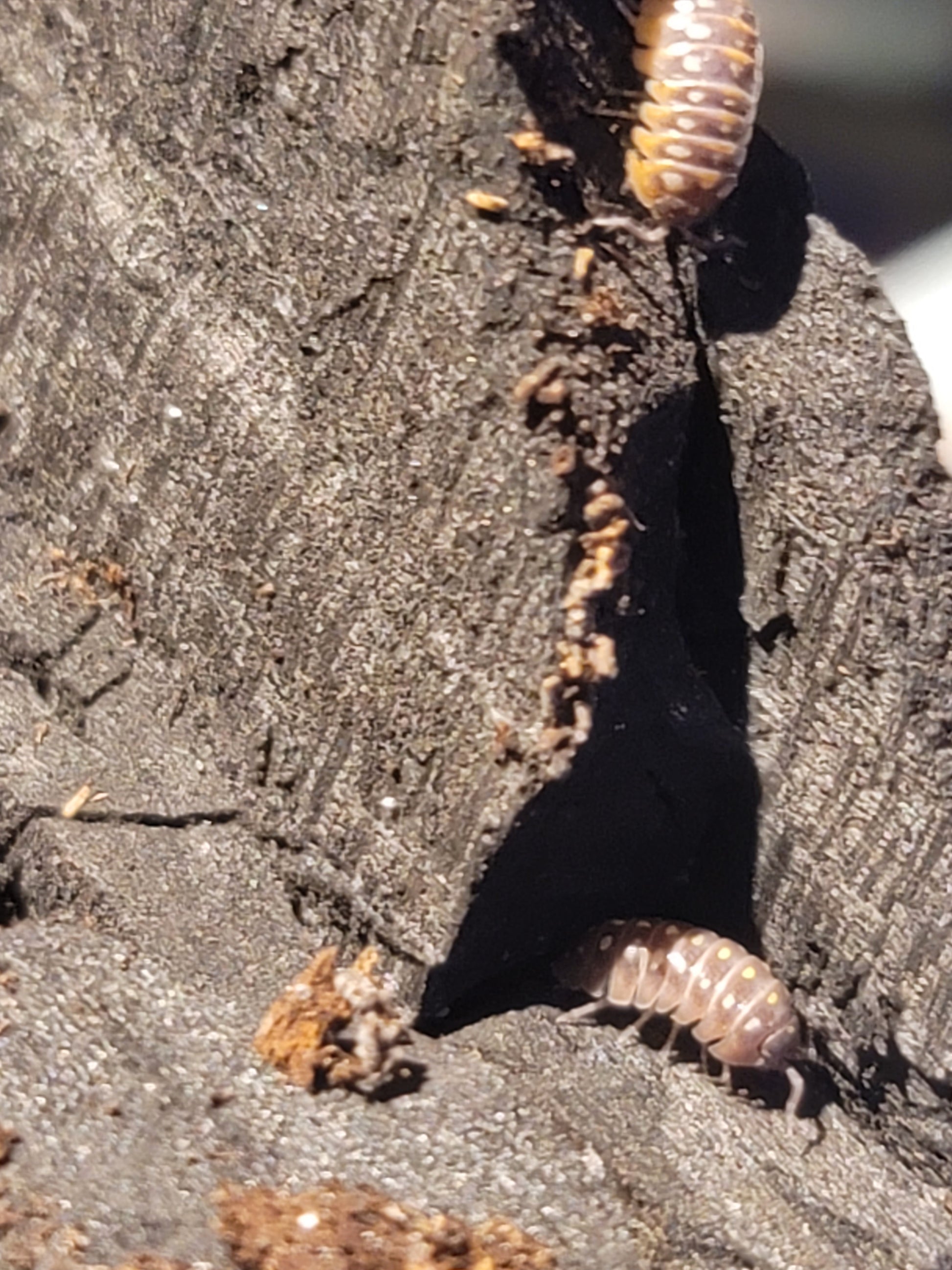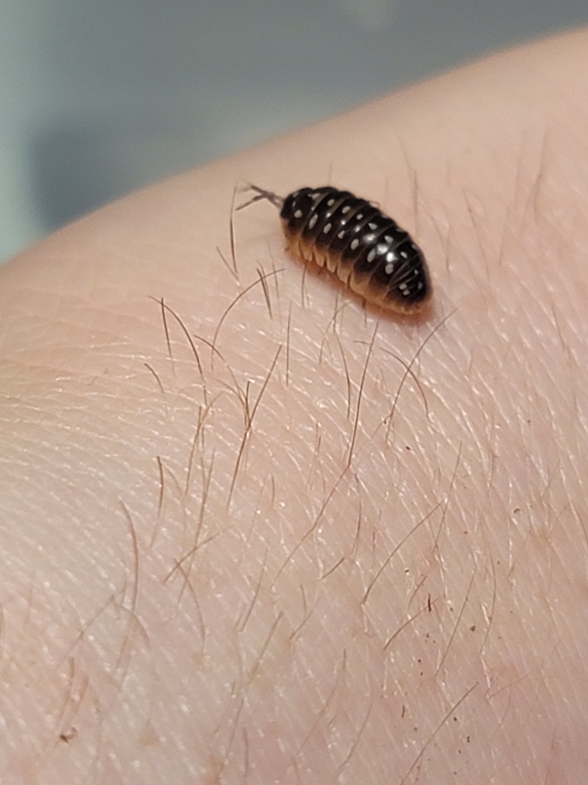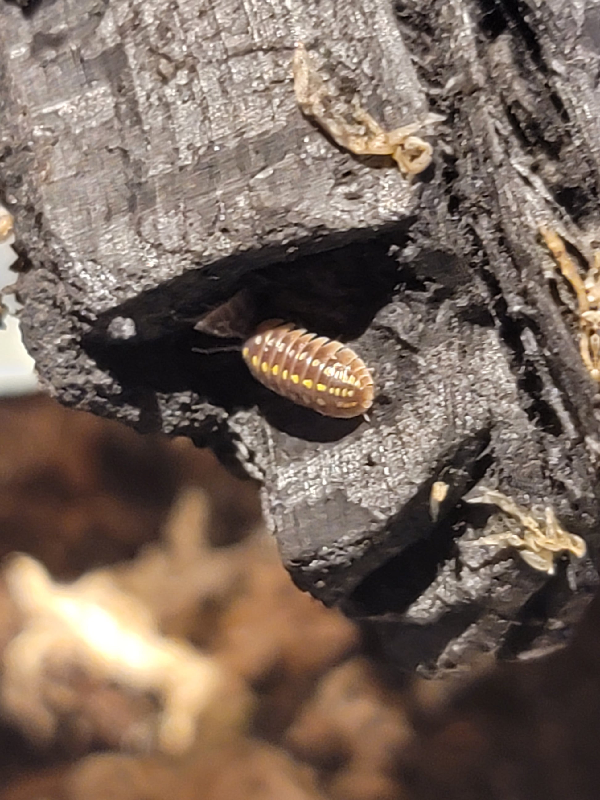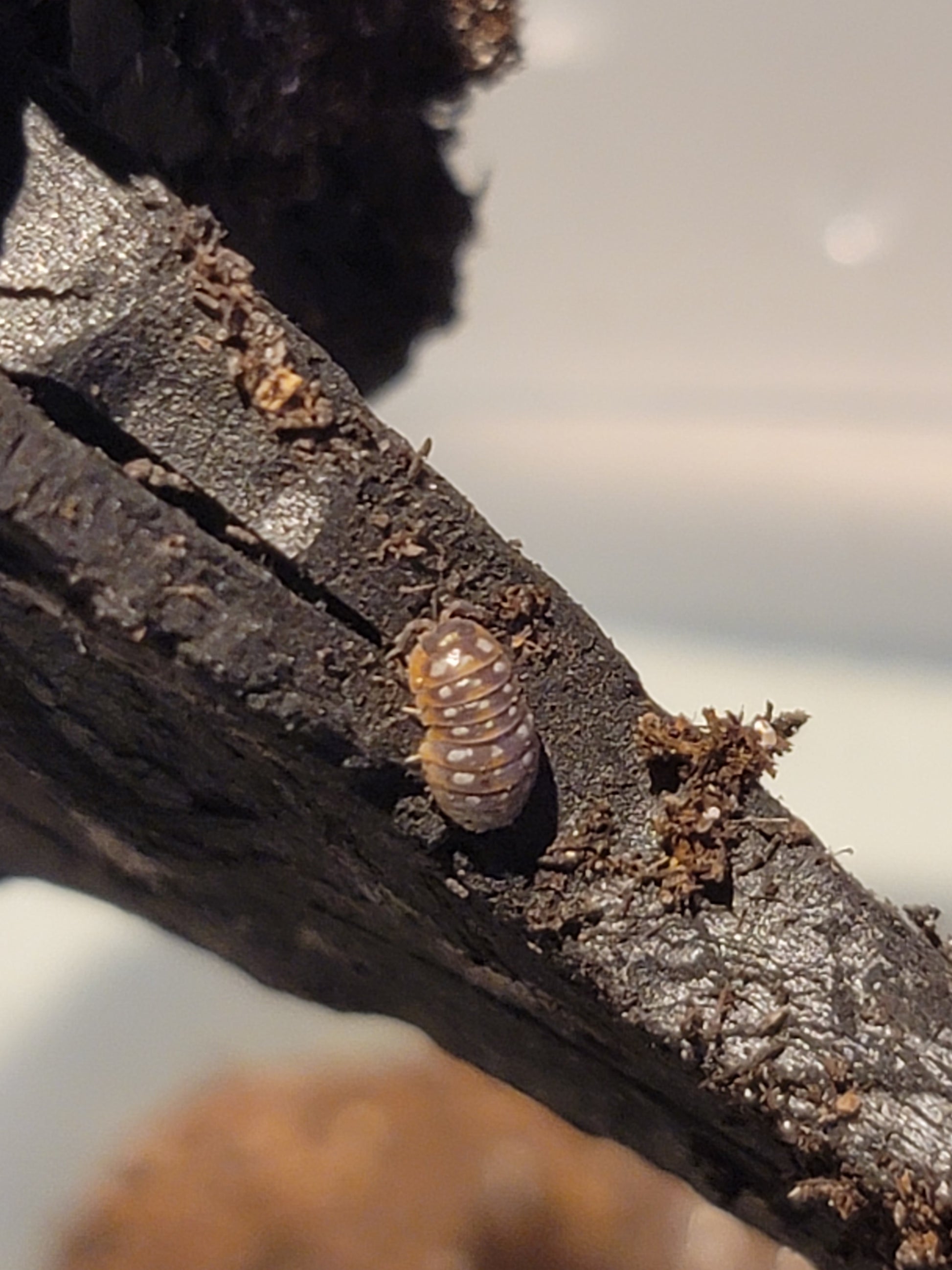 Pudding Isopods are from the genus Armadillidium. These Bbs are greyish brown with a thin skirt of white along the edge. They have three rows of spots from white to yellow.